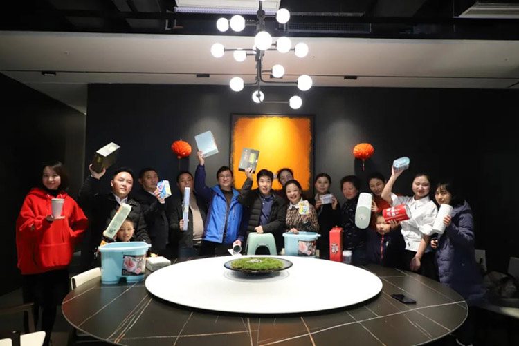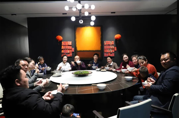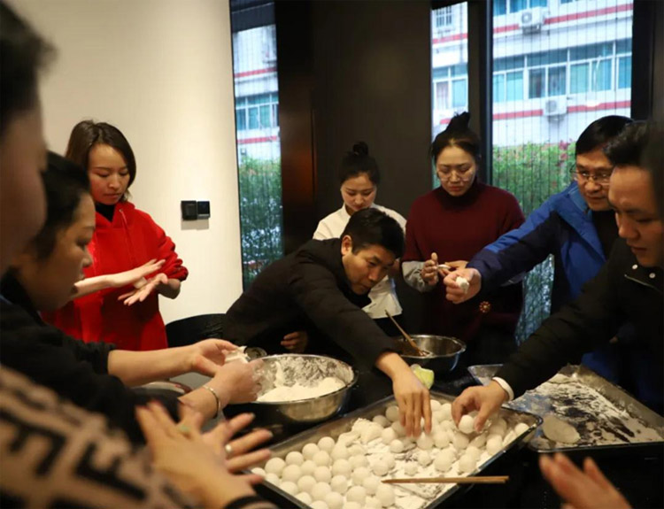 公司成員集體吃著圓滾滾的元宵,