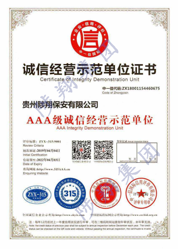 誠信經(jīng)營示范單位證書
