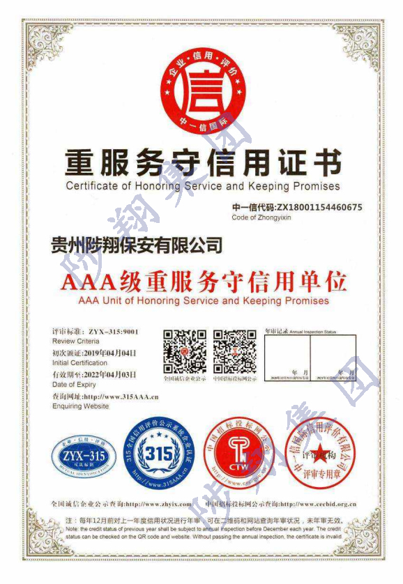 重服務(wù)守信用證書